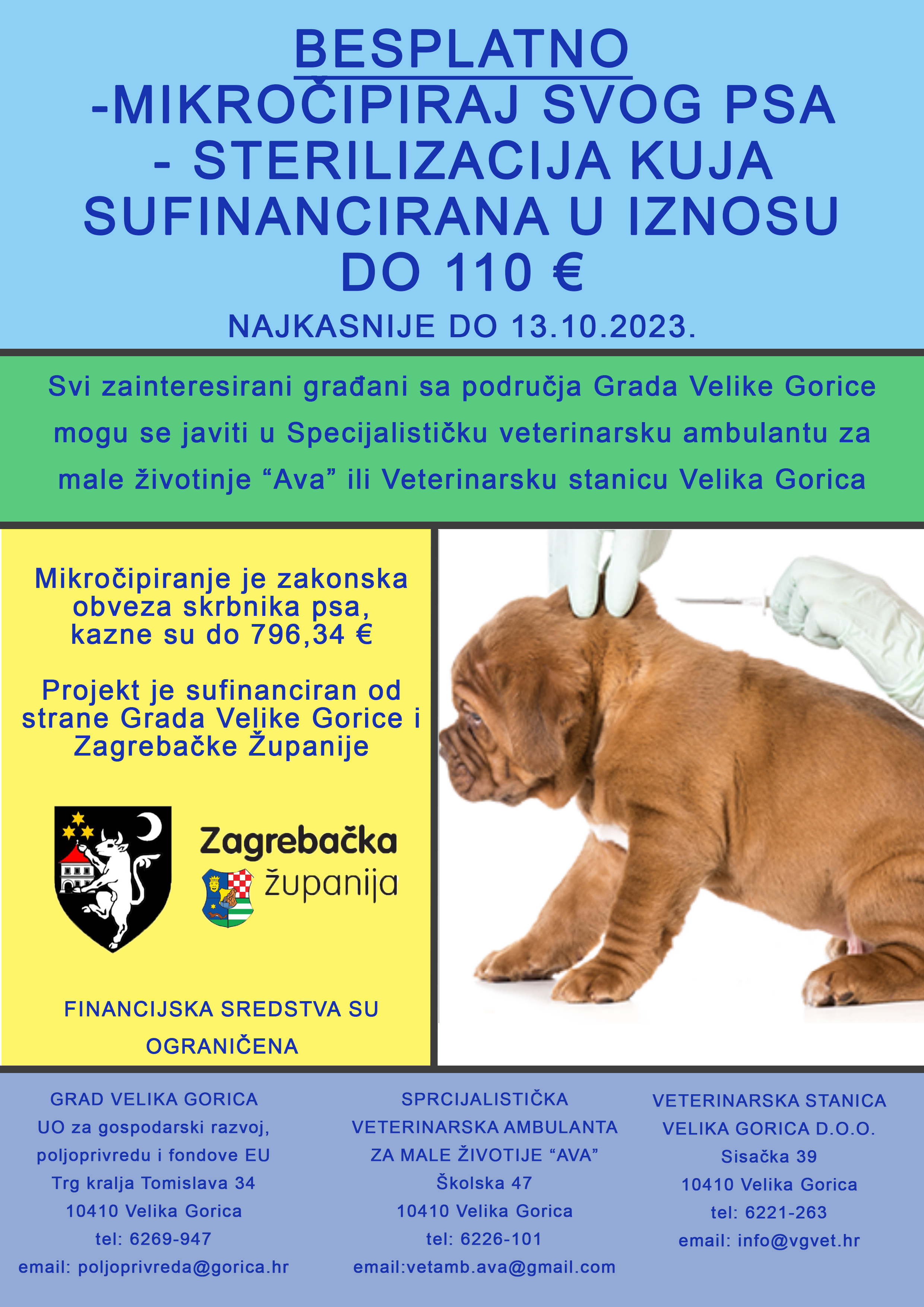 Grad Velika Gorica i Zagrebačka županija provode projekt besplatnog mikročipiranja pasa i sterilizaciju kuja u iznosu do 110 eura najkasnije do 13.10.2023. godine odnosno do utroška sredstava.