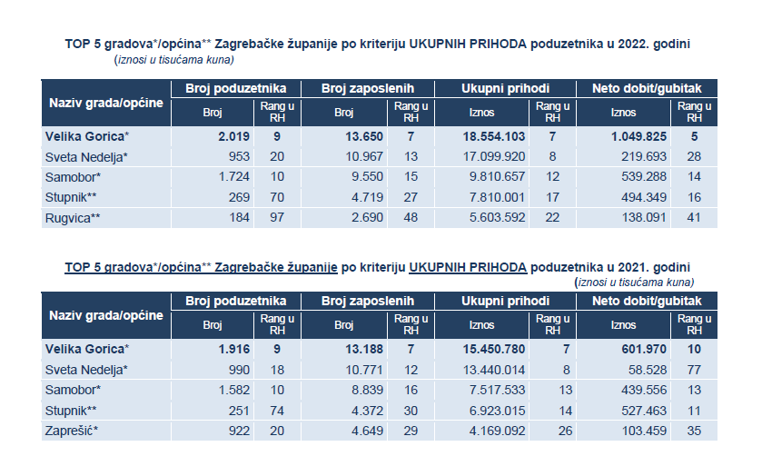 Broj poduzetnika u Velikoj Gorici povećan je u odnosu na 2021. za više od 100, broj zaposlenih je povećan za 462 osobe, ukupni prihodi su povećani za više od 3 milijarde kuna, a neto dobit je veća 400 milijuna kuna u odnosu na 2021. godinu.